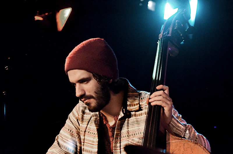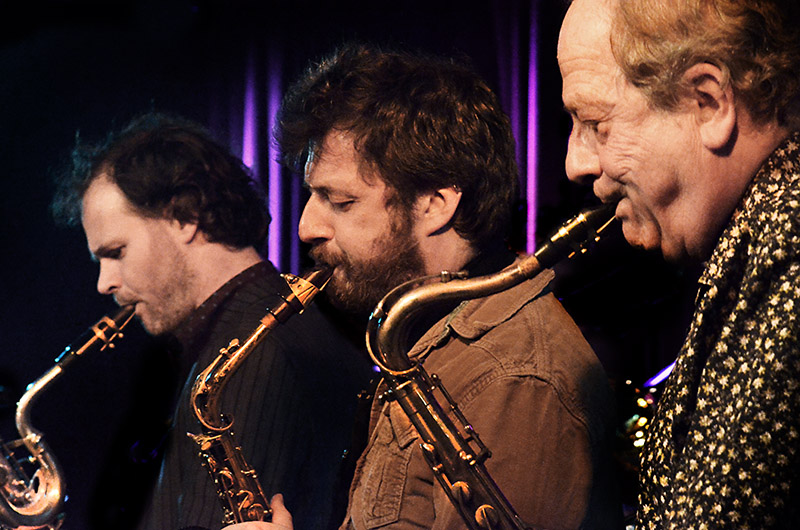 Contrabassist Laurens Smet, vibrafonist (en klarinettist) Tom Wouters en de blazers Bruno Vansina, Benjamin Boutreur, Michel Mast.