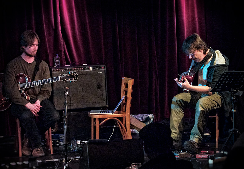De avond opende met een duo-optreden van Jacq Palinckx en Frank Crijns, gevolgd door het duo Bram Stadhouders en Aart Strootman. Een contrastrijker opening was nauwelijks denkbaar. Waar de vijftigers Palinckx en Crijns zich volledig overgaven aan de experimentele aspecten van de vrije improvisatie en hun snaren beroerden met kettinkjes en dekseltjes, gingen de twintigers Stadhouders en Strootman met behulp van laptop en effecten een stuk bedachtzamer te werk. Een schijnbaar chaotische klankwereld op een hobbelige ontdekkingsreis versus de beeldrijke ‘gecomponeerde’ ruimtelijke soundscapes waarin weinig aan het toeval werd overgelaten.