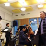 John Clayton repeteert op het Conservatorium met (v.l.n.r) Michele Tino (as), André Santos (g), Andreu Pitarch (d), João Pedro Coelho (p) en Giuseppe Romagnoli (b).