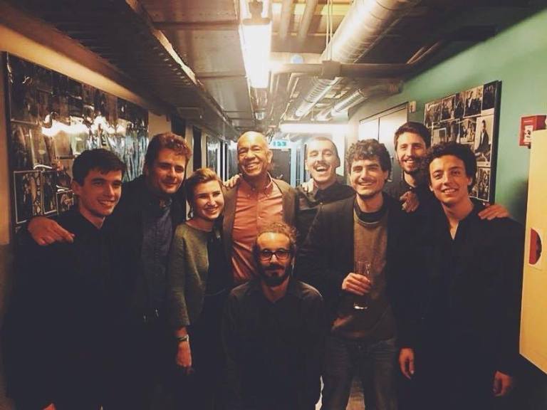 John Clayton met (v.l.n.r) Matthias Van den Brande, Jakob Grimm, Allison Philips, Emanuele Pellegrini, Dario Trapani, Michele Tino, Marco Zenini en Andreu Pitarch Mach.