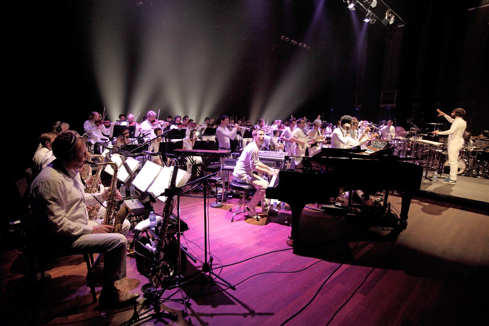 De feestende fusionband Snarky Puppy naast het onneembaar bastiljon van het Metropole Orkest.