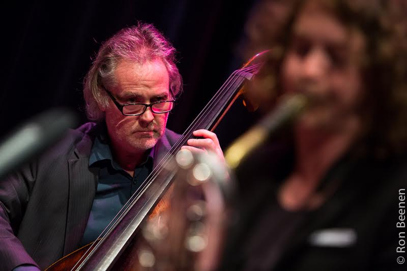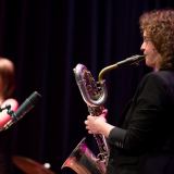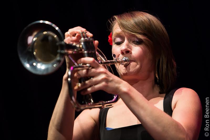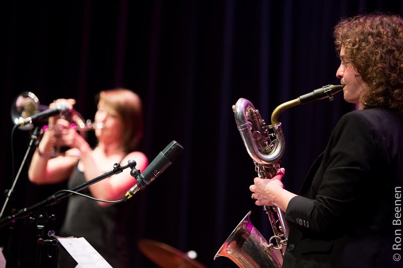 Ellister van der Molen op flügelhorn. Baritonsaxofoniste Tini Thomsen met contrabassist Jos Machtel.