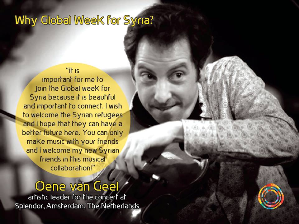 11 apr - Voor het tweede jaar op rij komen tijdens de Global Week for Syria muzikanten bijeen om de Syrische bevolking te steunen in hun roep om vrede. In dit kader worden ook in Nederland concerten georganiseerd, van 18 april tot 1 mei in zes steden.