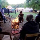Opwarmen bij een vuurtje voor de concerten van pianotrio Dawn of Midi en St. Germain.