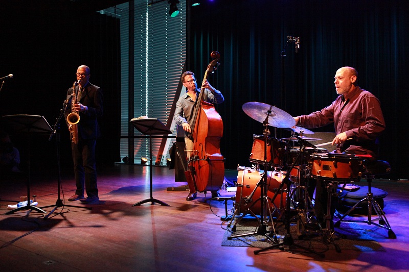 Larry Grenadier, Mark Turner en Jeff Ballard op het podium van Bimhuis.