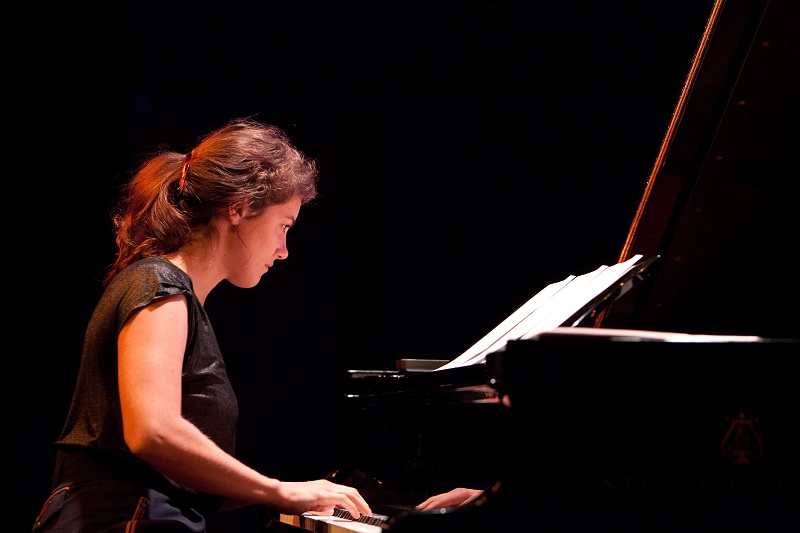 Pianiste Kaja Draksler, gitarist Raphael Vanoli en gelegenheidsensemble Badenhorst, Roelofs, Austbø, Brice, Eldh, Taubenfeld op het podium van Bimhuis.