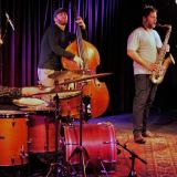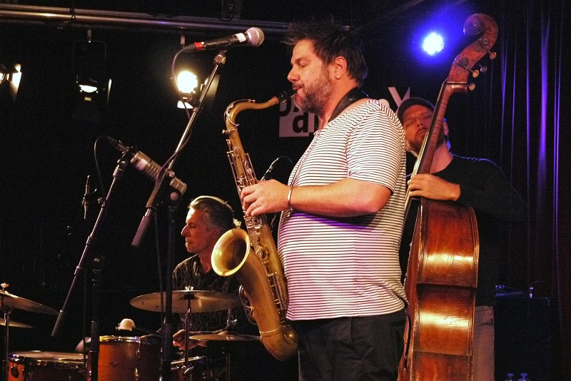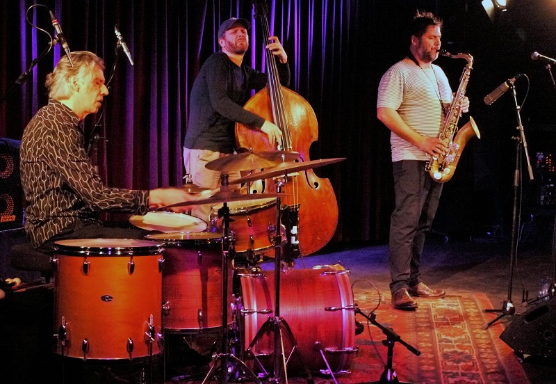 Slagwerker Makki van Engelen, bassist Johan Plomp en Mete Erker op tenorsaxofoon.