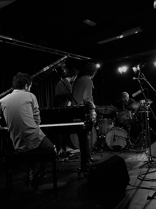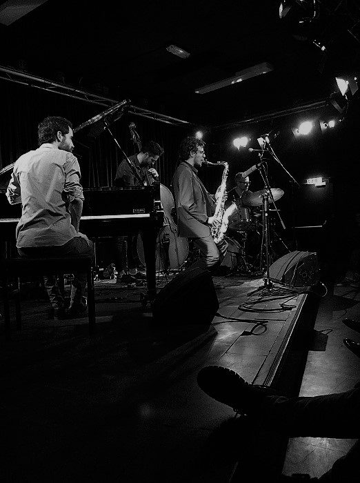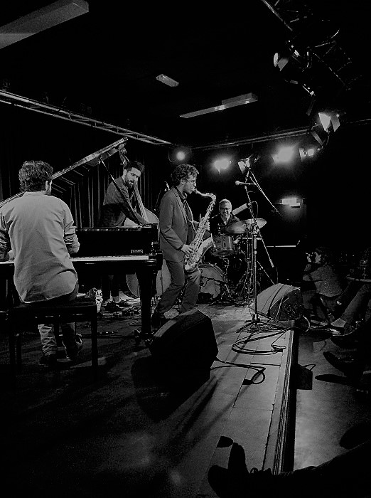 Tenorsaxofonist Oded Tzur omringd door pianist Nitai Hershkovits, contrabassist Petros Klampanis en drummer Ziv Ravitz.