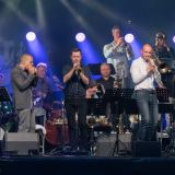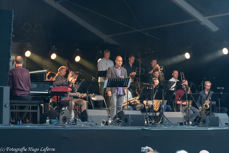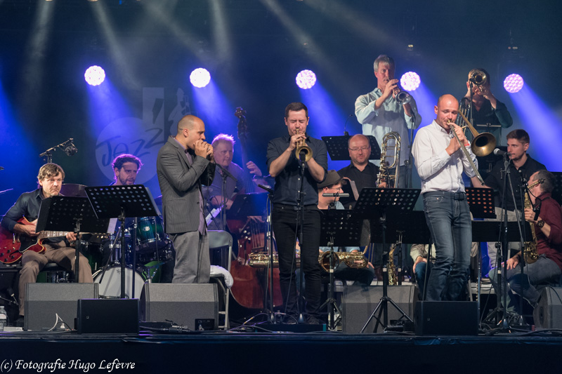 Jazz Station Big Band onder leiding van saxofonist Stéphane Mercier (m) en met mondharmonicaspeler Grégoire Maret.