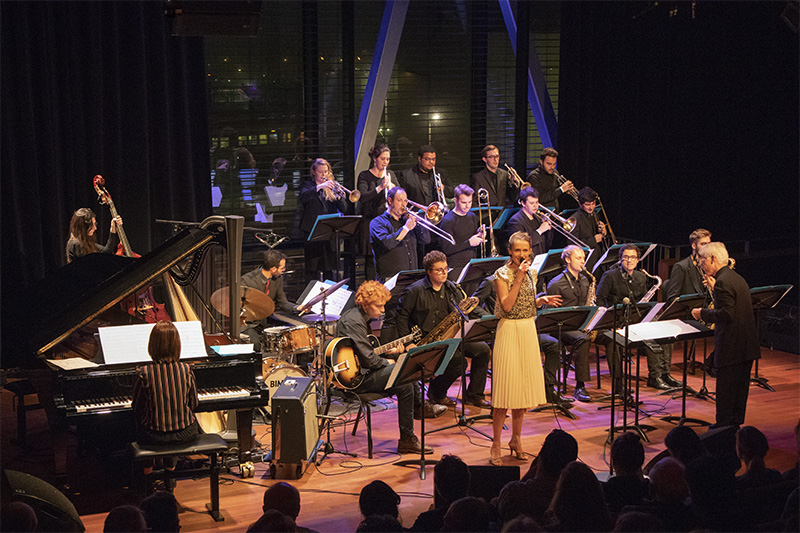 Koen Schouten is ceremoniemeester en leidt met flair elk optreden in. De avond start met een showcase van de Monday Big Band van het Conservatorium van Amsterdam. Er worden arrangementen van Jerry van Rooyen en Rob Pronk uitgevoerd onder leiding van Erik van Lier. Muziek die vaardig, maar enigszins schools wordt uitgevoerd. De musici moeten duidelijk nog groeien, maar de schitterende uitvoering van ‘Just One Of Those Things’ door zangeres Roos Jonker mag er zeker zijn.