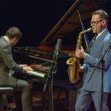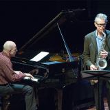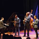 Saxofonisten Benjamin Herman, Mo van der Does en Ben van Gelder brengen hommage aan Peter Guidi, met Timothy Banchet achter de vleugel. Cor Bakker en Madeline Bell (© Ton van Leeuwen).