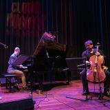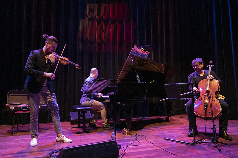 Violist Adam Baldych, cellist Vincent Courtois en pianist Rogier Telderman op het podium van Cloud Nine van Tivoli Vredenburg.