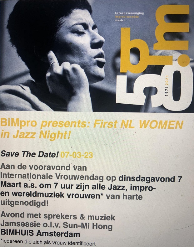 Op de sociale media plaatste BIMpro directeur Fleurine Verloop een oproep aan de jazzvrouwen om vooral in groten getale naar de First NL Women in Jazz Night te komen. Instrumentalisten, zangeressen, docenten, studenten, journalisten en jazzpromotors zijn welkom zolang je vrouw bent of - staat op de flyer – 'iedereen die zich als vrouw identificeert'. Vooraf aanmelden is gewenst en kan via fleurine@bimpro.nl.
