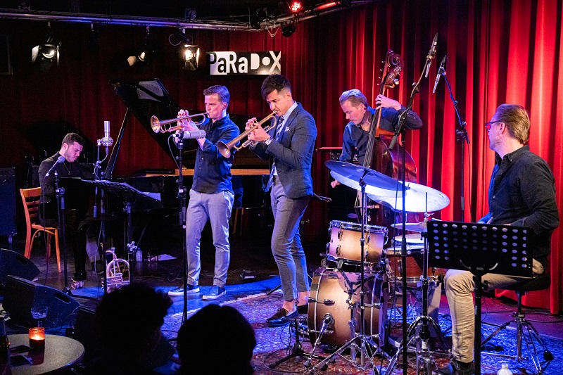 Jan van Duikeren’s Fingerprint met tenorsaxofonist Tom Beek. Het kwartet van trompettist Lachlan Craven (m) met tenorsaxofonist Steve Carson.