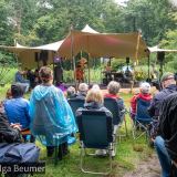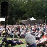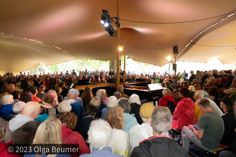 De weergoden spelen behoorlijk op tijdens het begin van de tweede festivaldag. Het geluid van de harde regen gaat een wrede confrontatie aan met het concert van violist Niek Baar met celliste Ella van Poucke en pianist Ben Kim. Bij het recital van de Belgische tromboniste Nabou Claerhout met zangeres Lynn Cassiers is het weer droog, maar het optreden van de dames gaat ten onder in een overdosis elektronica. In de buitenruimte gelden nu eenmaal andere spelregels en zijn soundscapes alleen maar gedoe. Een minder moment dat enigszins wordt goedgemaakt door het ‘Delirium voor vier vleugels’ van de Oekraïns-Nederlandse componist Maxim Shalygin. Muziek die meditatief begint en vervolgens steeds meer in kracht toeneemt.