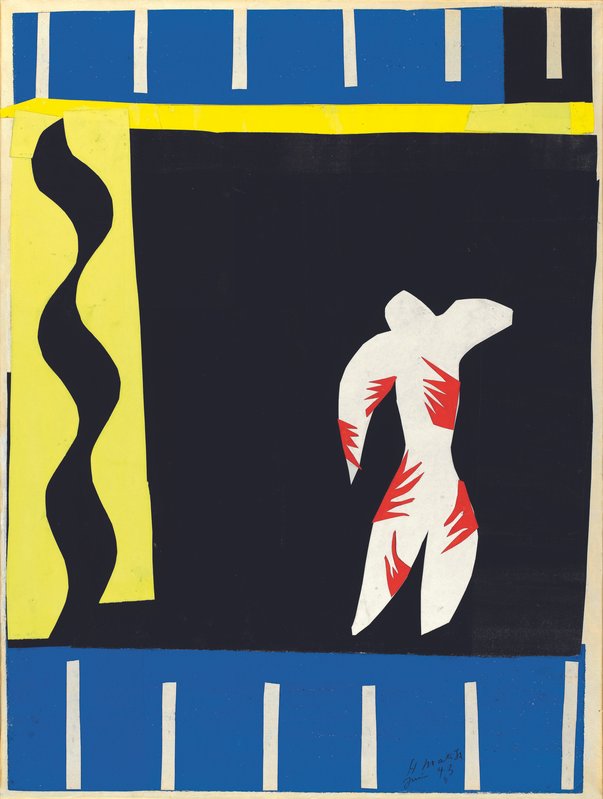 In 1947 verscheen het boek ‘Jazz’ bij uitgeverij Tériade in een beperkte oplage van 250 stuks. Het bevatte hoogwaardige afdrukken van twintig collages, waarin het circus, de mythologie en Matisses reizen centraal stonden. De titel, die hij samen met zijn uitgever bedacht, verwees naar de overeenkomsten tussen de ‘chromatische overvloed’ die jazzmuziek kenmerkt en Matisses beeldende werk dat daarvan het visuele equivalent is. In gekalligrafeerde teksten op de pagina’s tussen de afbeeldingen beschrijft Matisse hoe zijn swingende improvisatiekunst tot stand kwam: ‘Zoals een beeldhouwer een steen bewerkt, knip ik kleuren uit.’ Over de rol van de kunstenaar schrijft hij: ‘hij mag nooit de gevangene worden van zijn stijl, zijn reputatie of zijn voorspoed. Alles draait in de kunst om vrijheid.’![]()