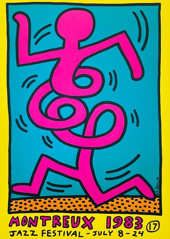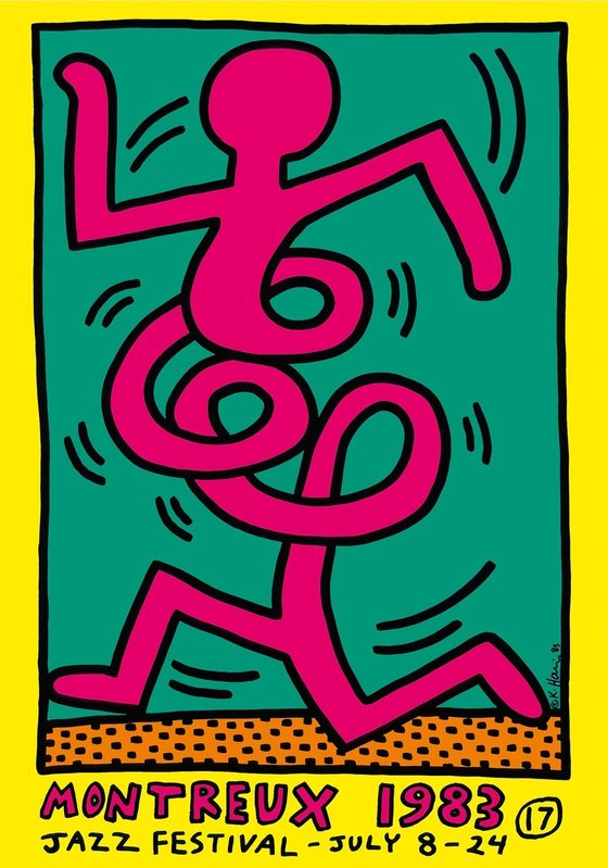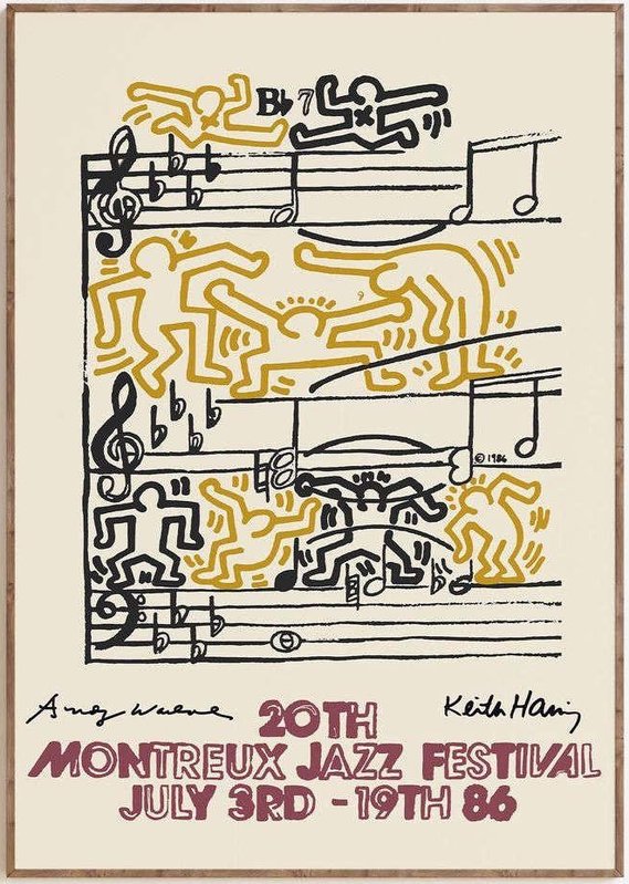 In 1986 nodigde het Montreux Jazz Festival de kunstenaar nogmaals uit om een poster te ontwerpen, ditmaal in samenwerking met popart godfather Andy Warhol (1928 – 1987). Toen Pierre Keller op de afgesproken datum naar Amerika reisde om het resultaat te bekijken bleek er nog niets op het doek te staan. In allerijl werd Warhol opgetrommeld om een paar notenbalken te schilderen waar Haring ‘on the spot’ zijn mannetjes tussendoor liet dansen. Hoe jazz wil je het hebben? Ook dit ontwerp kreeg Keller in drie kleurvarianten mee. Op de terugweg ontdekte de artistiek adviseur dat de verbluffend geslaagde schilderijen nog niet gesigneerd waren. Een dag later stuurden Warhol en Haring hem alsnog hun handtekeningen toe.