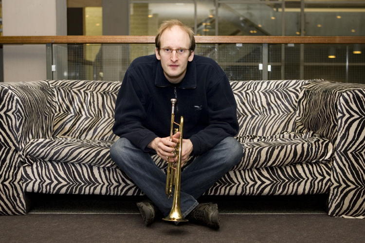 Naast jazzmusicus is Niels Tausk docent aan het Koninklijk Conservatorium in Den Haag. Hij geeft solfège- en combolessen. Het gebouw ligt op een plek die prima te bereiken valt. Maar daar is dan ook alles mee gezegd. Verbazingwekkend dat in zo’n kil betonblok, omgeven door autowegen zoveel inspiratie op kan worden gedaan. Het uiterlijk van het Haags Conservatorium staat niet alleen haaks op wat er voortgebracht wordt, maar ook op de voorstelling die de naam koninklijk oproept in architectonisch opzicht. Binnen is het al niet veel beter. Grauwe, grijze muren en lange, saaie gangen. Gelukkig maakt het gezellige gekakel om ons heen en de hartelijke begroeting van Niels veel goed. Omdat de lokalen bezet zijn, begeven we ons naar de kantine. Als we daar eindelijk een tafel hebben bemachtigd waar je níet letterlijk van kunt eten, steekt de trompettist van wal.