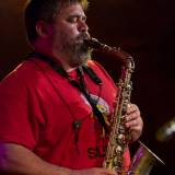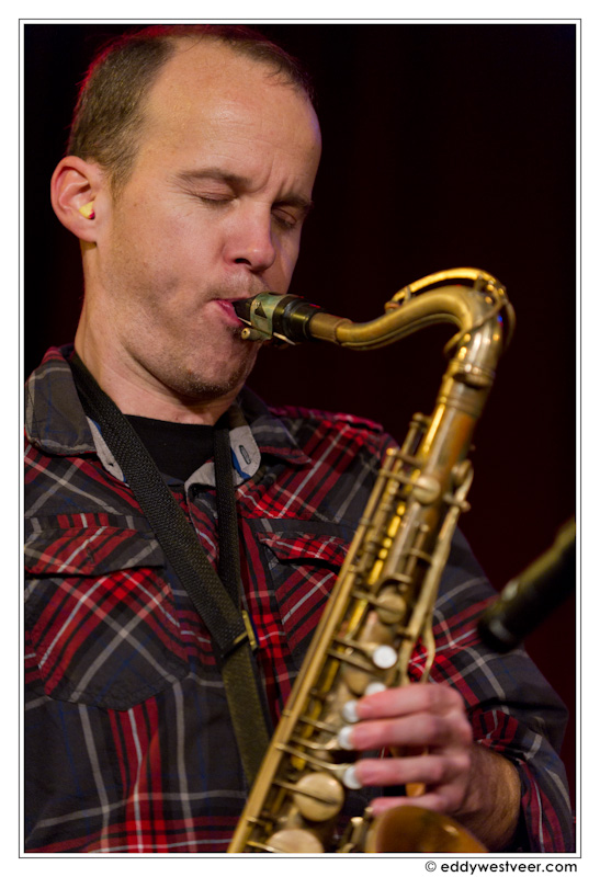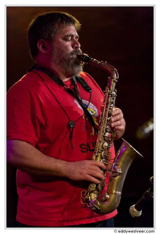 In Middelburg speelde de groep het album bijna integraal. De blik op jazz van Endangered Blood is fris. Een hoekige, groovy poweruitvoering van Monk’s ‘Epistrophy’ kwam voorbij waarbij Speed’s solo leunde op de zware raspende basklarinetlijn van Noriega. En, ‘Uri Bird’, een ode aan onder meer Lennie Tristano. Het op de saxofonen gedubbeld thema leek een mitrailleursalvo maar Speed spon vervolgens trage en enorm lange lijnen op tenor. Tristano had liever geen drummer of drummers die zich beperkten tot een meer metronomische begeleiding. Black is echter constant op zoek naar nieuwe invullingen, gaat ruig mee in het ritme, laat plotseling alleen de hihat en basdrum doorlopen om ritmische tegenpatronen op toms en bekkens te gaan spelen en pakt nonchalant ander materiaal om in te zetten.