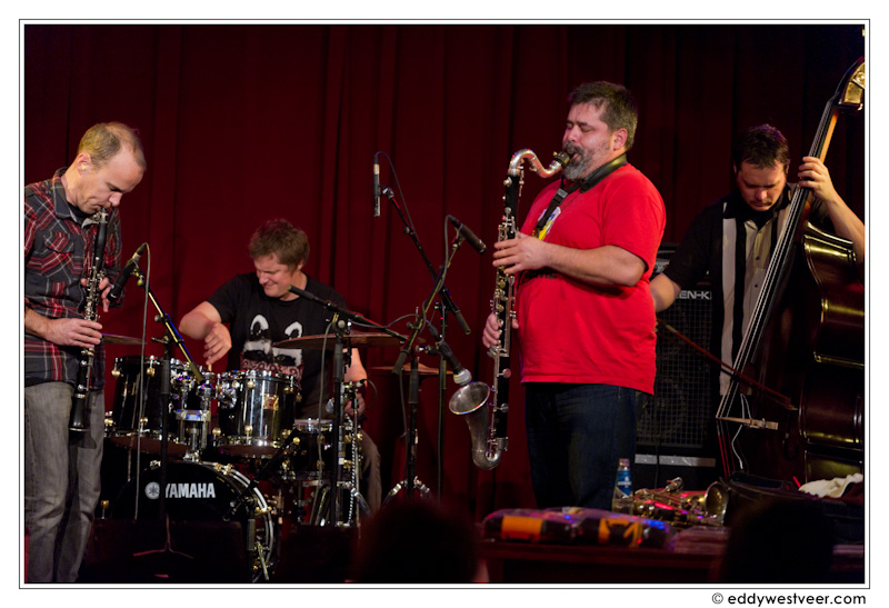 Chris Speed, Oscar Noriega, Jim Black en Trevor Dunn vormen de nieuwe band Endangered Blood dat optrad in Middelburg.